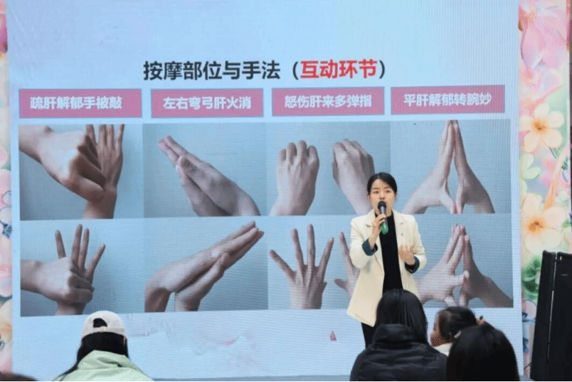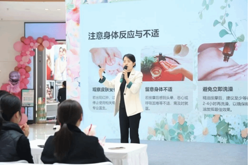 实践环节中,专业指导老师上台,为大家演示了如何正确选择和使用精油进行穴位按摩,并强调了按摩过程中的注意事项和禁忌症。