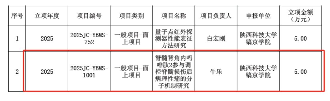 医药工程学院深度贯彻董事会"质量立校、人才强校、特色兴校"的办学理念,在校领导"顶层设计、精准施策"的战略布局以及与其他职能部门的紧密合作下,我院科研工作再获突破。牛乐博士申报的“脊髓背角内吗啡肽2参与调控脊髓损伤后病理性痛的分子机制研究”获批陕西省科技厅自然科学基础研究计划面上项目(编号:2025JC - YBMS - 1001 ),立项金额5万元。牛乐博士主持多项课题,发表15篇SCI论文(含一作4篇、通讯2篇),获省部级奖项、专利等多项成果。此次立项既展现我校科研实力,也为学院学术研究注入新动能,彰显学校师资队伍建设与高层次人才引进成效,提升学院在医药工程领域影响力,为区域科研创新和学科发展提供支撑。期待全院教师以其为榜样,产出更多成果。