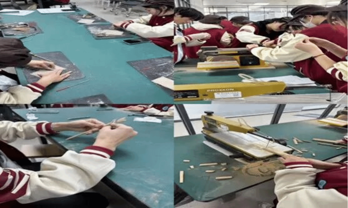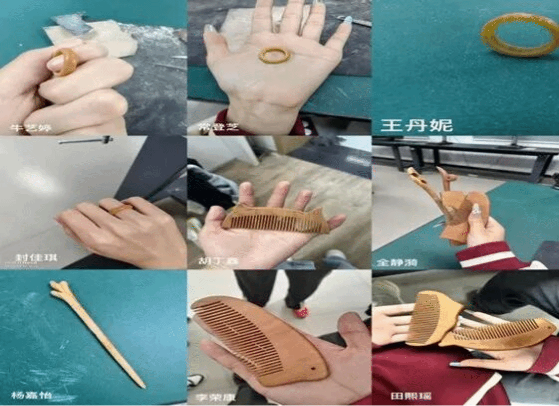 其中我班的颜琦馨同学在制作戒指的时候说:“从老师那里听闻,实训中会有木艺工坊这一环节。打磨的戒指于我而言意义非凡,这是我在实训中的第一件作品。戒指的环形造型象征着永恒,所以我要将它献给我最亲爱的妈妈,寓意着对妈妈的爱和亲情没有尽头。在打磨戒指时,那小心翼翼的模样,恰似儿时妈妈扶着我蹒跚学步。其间,因操作不当,手指被磨损,疼痛袭来。可每当这时,对妈妈的爱与妈妈给予我的无尽亲情,就化作一股力量,支撑着我坚持下去。如今,这承载着我满满爱意的木艺作品终于完成了。它们虽不昂贵华丽,却饱含着我对家人最真挚的情感。”