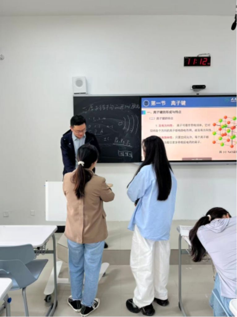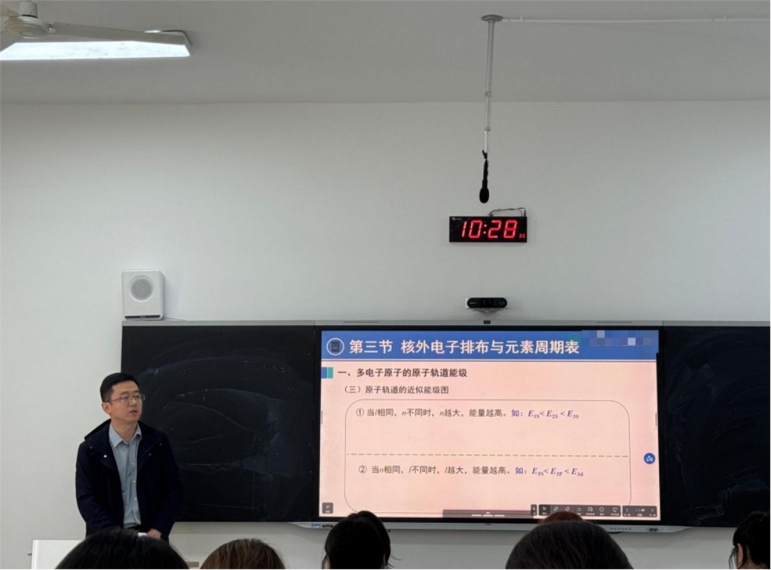 在教学展示环节,王育伟老师围绕“核外电子排布”章节,以“知识回顾—新知建构—能力升华—教学支持”为逻辑主线,呈现了一节系统严谨、富有深度的专业课堂。在知识回顾环节,他通过精准提问策略,引导学生重温“量子数”等核心概念,有效激活学生已有认知,为新知学习奠定基础。在新知讲授部分,王老师以“原子结构的近似能级”为重点,融合学科前沿动态与科研实例,采用板书勾勒知识框架、PPT辅助呈现数据与案例的多模态教学手段,构建起层次分明、内容充实的教学体系。在难点突破方面,他通过“前置预习提示—课中关联引导—课后总结巩固”的全流程支持策略,帮助学生构建“预习—学习—复习”的完整认知链条,显著提升教学实效。整节课不仅展现了王老师扎实的专业功底和清晰的教学逻辑,也为观摩教师提供了科研反哺教学、课程思政有机渗透、多模态辅助教学相结合的先进范式,实现了教学方法可复制、可迁移的示范目标。