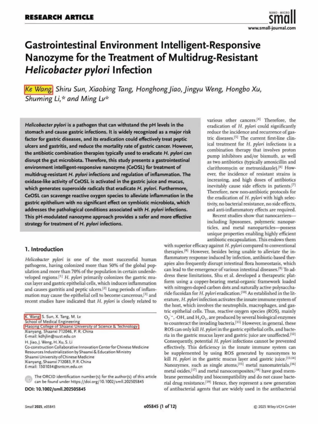 近日,我院王科博士在 Small 上发表题为“Gastrointestinal Environment Intelligent-Responsive Nanozyme for the Treatment of Multidrug-Resistant Helicobacter pylori Infection”SCI期刊一篇,JCR分区为Q1,影响因子12.1。
