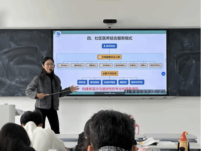 为精准对接社区健康服务领域人才培养需求,破解“医养结合服务模式”教学中的重难点,推动《社区健康服务与管理》课程教学质量迭代升级,同时搭建教师间教学经验互鉴平台,2025年10月16日,健康服务与管理教研室组织全体教师在教317开展集体观摩活动。本次观摩课活动聚焦专业骨干教师苗静副教授主讲的“社区医养结合服务模式”内容,共同探索“热点内容进课堂、教学贴合行业需”的实践路径,以沉浸式教研助力教师专业能力提升。