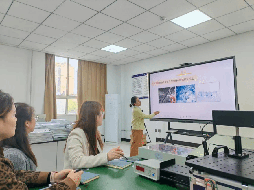会议开始,李晓娟老师通过微讲座的形式,以《物理化学》课程为切入点结合自身教学经历,精准聚焦课堂教学中存在的痛点问题,毫无保留地分享了独到且实用的解决策略。一是强调备课务必充分,针对课程中的重要知识点,要精心、合理地设置课堂练习,从基础到进阶层层递进,助力学生逐步攻克知识难点,让学生获得成就感,产生对后续知识学习的渴望。二是主张多提问并走下讲台,深入学生中间,打破传统教学的空间隔阂,近距离观察学生反应,鼓励学生大胆发言,让课堂氛围更加活跃。三是对于简单知识点或开放性讨论习题的教学,以小组作业汇报的形式进行,随机点名让学生走上讲台讲解,使学生从被动接受转变为主动输出,真正全身心参与到课堂中,在“动起来”的过程中切实掌握知识。四是巧借先进技术如“数字人”等工具,通过提升课堂教学趣味性而提升学生课堂参与度。